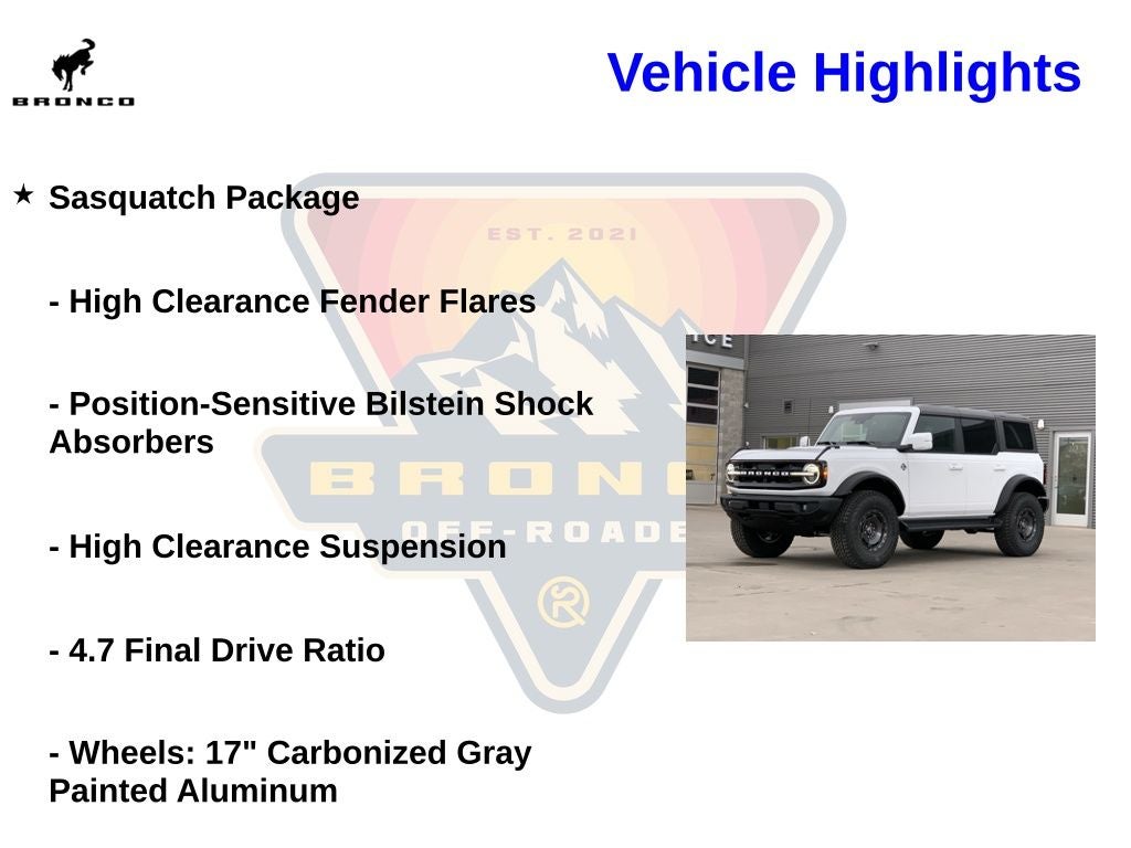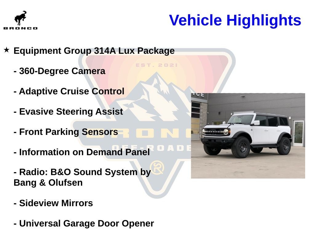 2025 Ford Bronco Outer Banks Oxford White 2.7L EcoBoost V6 Price includes the following rebates. See dealer for details to confirm eligibility:$2500 - Retail Customer Cash. Exp. 03/31/2026
