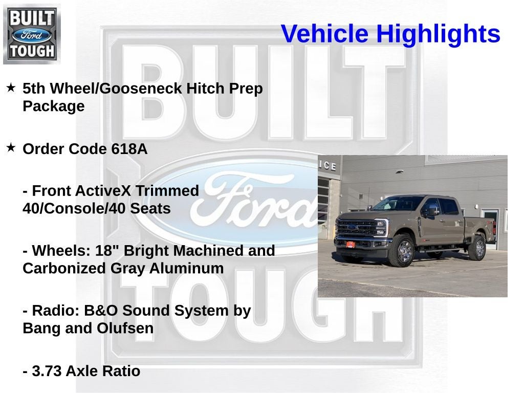 Factory MSRP: $87,775 4WD, 5th Wheel/Gooseneck Hitch Prep Package, 6 Angular Bright Anodized Step Bars, Chrome Door Handles, Chrome Exhaust Tip, Chrome Package, Ford Connectivity Package (1-Year Included), FX4 Off-Road Package, Hill Descent Control, Internet access capable: 5G Modem - Ford Connectivity Package, Navigation system: Connected Navigation, Off-Road Specifically Tuned Shock Absorbers, Order Code 618A, Unique Chrome Mirror Caps, Unique FX4 Off-Road Box Decal, Wheels: 20 Chrome PVD Aluminum.