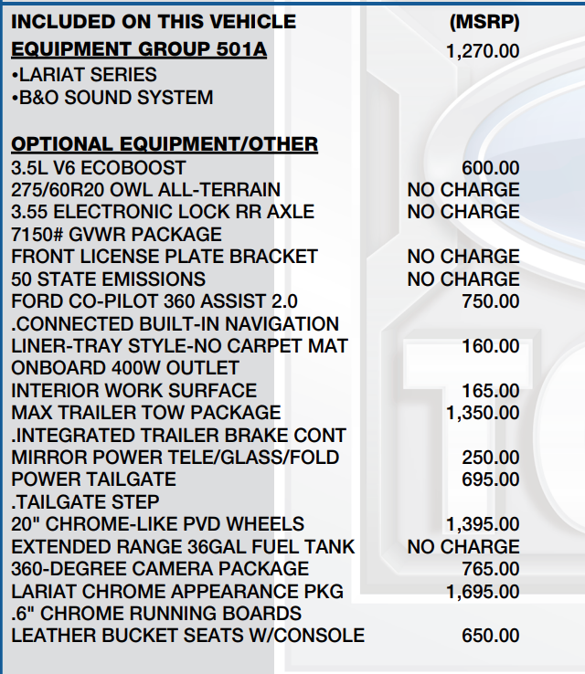 *BOUGHT HERE*, *SERVICED HERE*, *CLEAN CARFAX*, 4WD, 6 Chrome Running Board, Chrome 2-Bar Grille w/4 Minor Bars, Chrome Door & Tailgate Handles w/Body-Color Bezel, Chrome Single-Tip Exhaust, Chrome Skull Caps on Exterior Mirrors, Class IV Trailer Hitch Receiver, Connected Built-In Navigation, Equipment Group 501A Mid, Evasive Steering Assist, Extended Range 36 Gallon Fuel Tank, Ford Co-Pilot360 Assist 2.0, Integrated Trailer Brake Controller, Intelligent Adaptive Cruise Control w/Stop & Go, Intersection Assist, Lariat Chrome Appearance Package, Max Trailer Tow Package, Navigation system: Connected Navigation (90-Day Trial), Onboard 400W Outlet, Pro Trailer Backup Assist, Radio: B&O Sound System by Bang & Olufsen, Universal Garage Door Opener, Wheels: 18 Chrome-Like PVD.