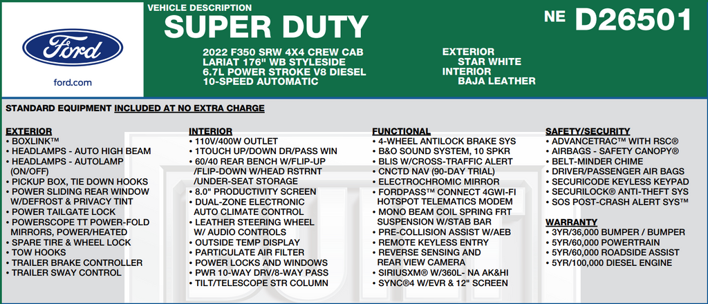 *SERVICED HERE*, *CLEAN CARFAX*, 4WD, 5th Wheel/Gooseneck Hitch Prep Package, 6 Angular Bright Polished Step Bars, Body-Color Door Handles w/Chrome Insert, Chrome Exhaust Tip, Chrome Package, Easy Entry®/Exit Memory Driver's Seat Feature, Electronic-Locking w/3.55 Axle Ratio, FX4 Off-Road Package, GVWR: 11,300 lb Payload Package, Hill Descent Control, Lariat Value Package, LED Box Lighting, Memory Power-Adjustable Pedals, Navigation system: Connected Navigation, Off-Road Specifically Tuned Shock Absorbers, Order Code 618A, Power Heated/Ventilated Driver Seat w/Memory, Power Heated/Ventilated Passenger Seat, PowerScope Trailer Tow Mirrors w/Heat, PowerScope Trailer Tow Mirrors w/Memory, Remote Start System, Unique Chrome Mirror Caps, Unique FX4 Off-Road Box Decal, Wheels: 18 Chrome PVD Aluminum.
